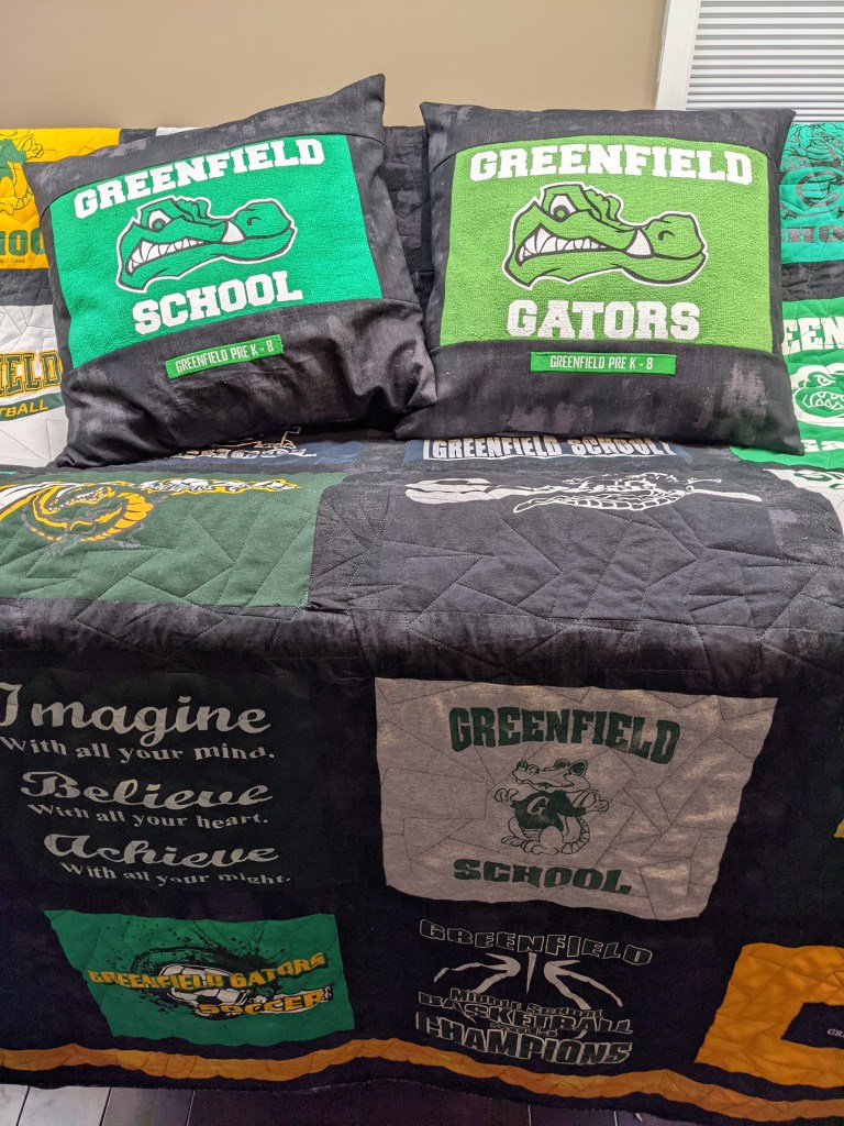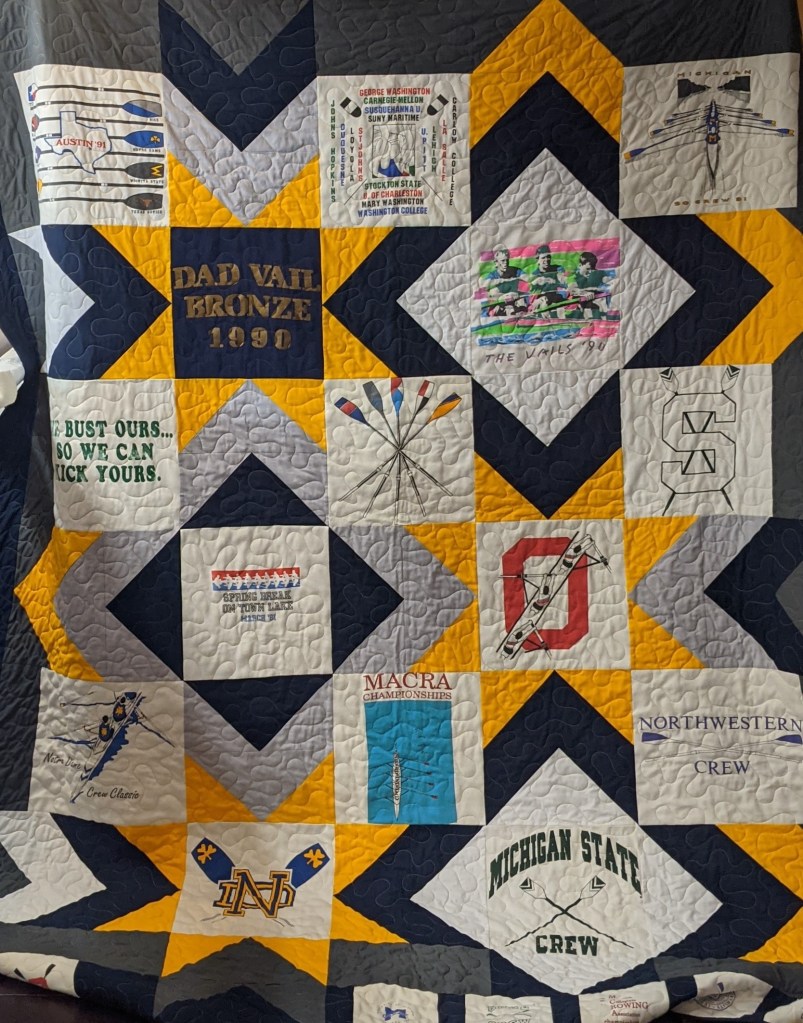 T Shirt Quilts are very customizable, and you’ll receive a preview design before shirts are cut. You provide your favorite T Shirts that are most meaningful to you, and we’ll talk about design and color options that you like. Contact me for pricing information.